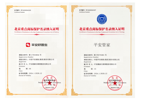 1月16日,由北京商标协会主办的“首届北京商标品牌盛典”在北京隆重举行。作为首都知识产权保护领域的年度盛事,大会正式发布2025年度“北京重点商标保护名录”(下称:名录)。中国平安旗下医养生态业务旗舰品牌“平安好医生”与居家养老服务品牌“平安管家”,凭借深厚的品牌积淀、卓越的市场公信力及扎实的业务护城河,经权威评审严格筛选,双双成功入选。