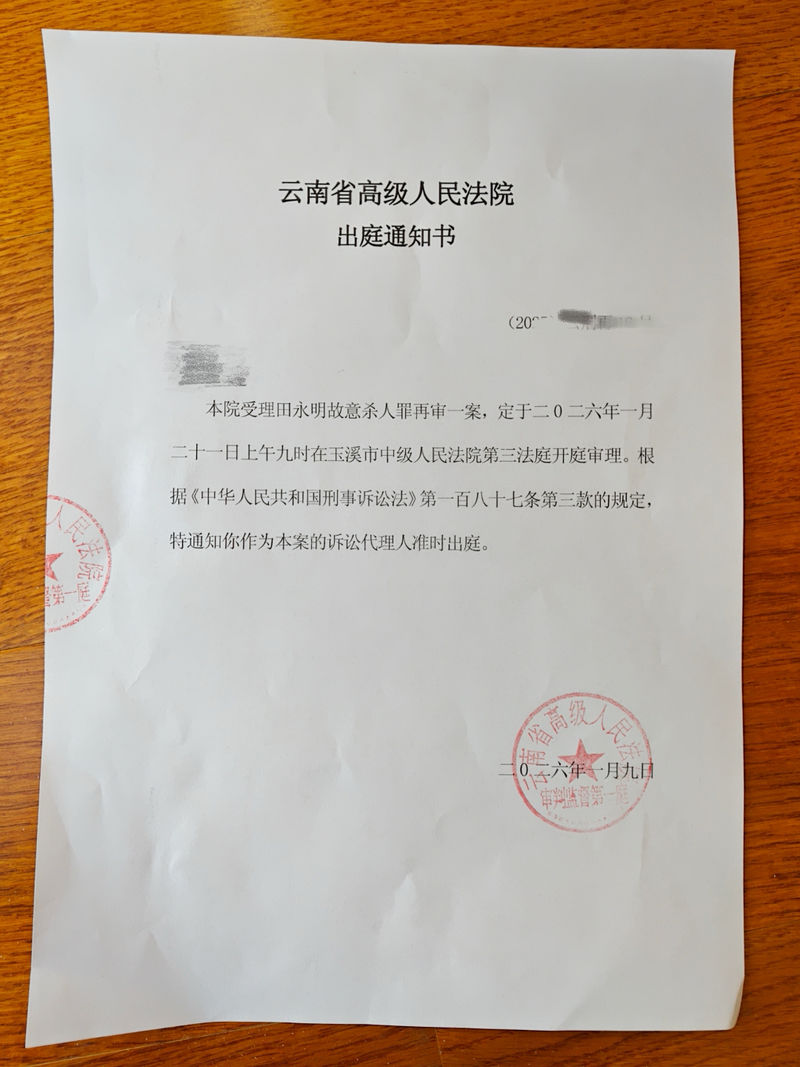 1月21日上午,田永明故意杀人案再审开庭。图为相关诉讼代理人收到的出庭通知书。受访者供图