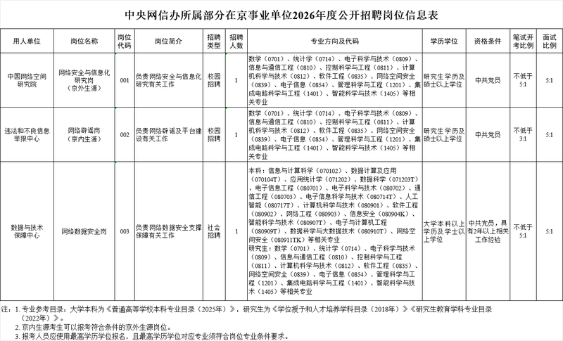 新京报讯 1月28日,中央网信办干部局发布《中央网信办所属部分在京事业单位2026年度公开招聘公告》。