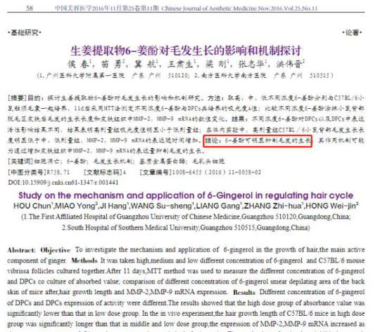 国内在2016年就有关于生姜用于脱毛的相关研究。南方医科大学的一项临床试验证实,生姜中姜辣素的活性成分之一6-姜酚,它不仅不利于生发还会抑制毛发生长,为此可作为脱毛药物,且抑制毛发生长效果较好,所以指望用生姜来生发是不现实的。