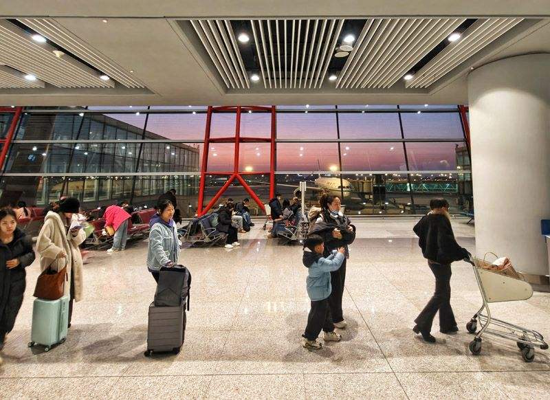 旅客走进首都机场T3航站楼出发层准备办理乘机手续。据民航局预测数据,节前2月13日至15日、节后2月22日至23日,首都机场客流集中度高,日均超过21万人次。