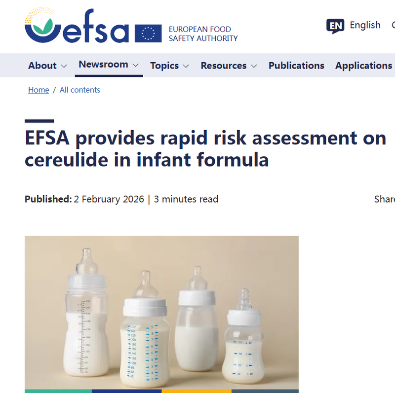 欧盟食品安全局发布“婴幼儿配方食品中蜡样芽衣杆菌毒素的快速风险评估方法”。 欧盟食品安全局网站截图