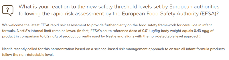 雀巢称,欧盟食品安全局发布的参考剂量为0.014微克/千克体重,相当于产品中0.43纳克/克(1纳克等于0.001微克),而雀巢产品目前使用的标准为0.2纳克/克。雀巢还呼吁,协调科学的风险管理方法,以确保所有婴儿配方奶粉产品均达到蜡样芽胞杆菌毒素“无法检出”的水平。