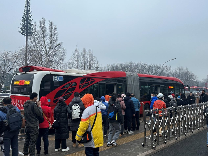 玉泉路口西公交站(向西方向),早高峰乘客排队候车,现场多名工作人员维持秩序、引导乘车。千龙网记者 徐锟 摄