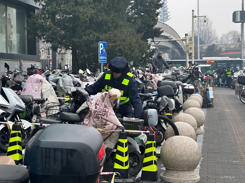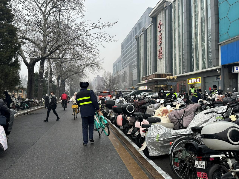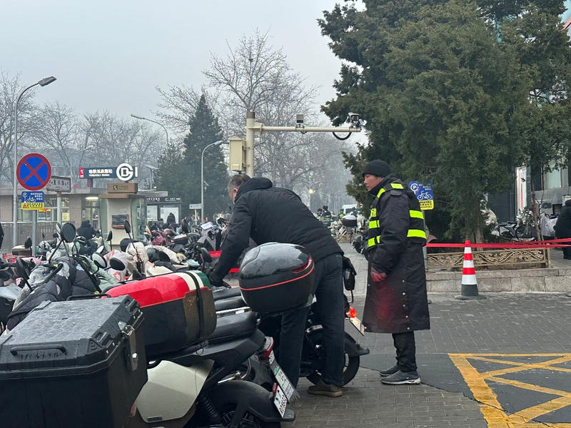 自2026年2月15日北京地铁1号线古城、八宝山两站因施工封站后,地铁玉泉路站的客流量明显攀升,成为周边居民出行的“主阵地”。 面对非机动车与行人交织带来的通行压力,相关部门加大人力投入,多措并举缓解拥堵。图为今天(3月2日),春节假期复工后的第一个周一,早上7点,玉泉路地铁站外,现场工作人员正穿梭于非机动车之间,将一辆辆电动车挪移、摆正。千龙网记者 徐锟摄