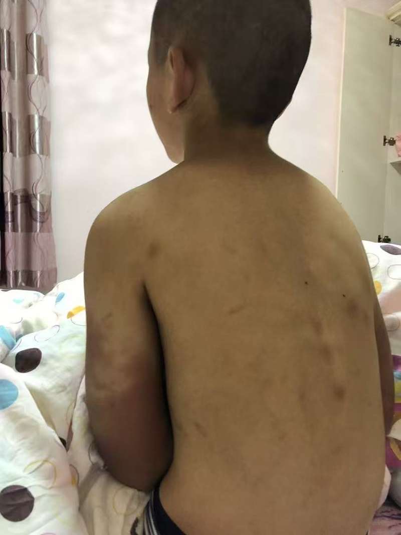 直到为孩子洗澡、擦拭身体时,张娟才终于明白他“闪躲”的原因:张珅研的两条胳膊肿胀,从肩膀往下至小臂处,全都是紫红色的伤痕,背部也是大大小小、深浅不一的瘀青印。“这是什么时候打的?”“两三天了。”张珅研小声回答。