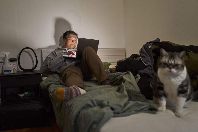 3月21日中午,陈建在沙发上小憩。每天夜里进行AI工作,他的作息时间被打乱。