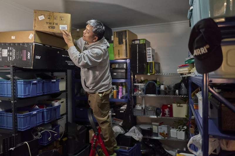 3月21日,河北燕郊。陈建家的仓库里,摆放着传统影视工具。他专门找收纳师将其摆放得整整齐齐。