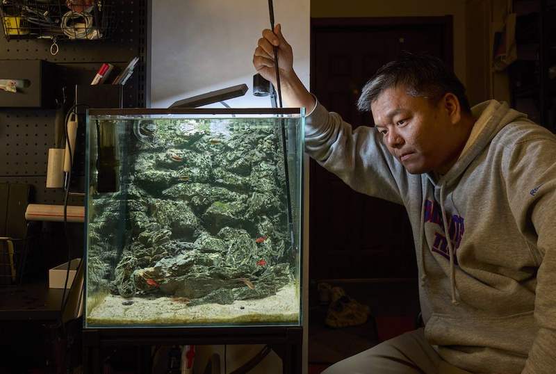 工作间隙,他会拿起小刷子,仔细清理工位旁的鱼缸。陈建酷爱养鱼,这样的鱼缸,他曾经有11个,围满了他的客厅。而现在,因为没有精力打理,陈建将大多数的鱼送了出去,只剩下十来条小鱼。