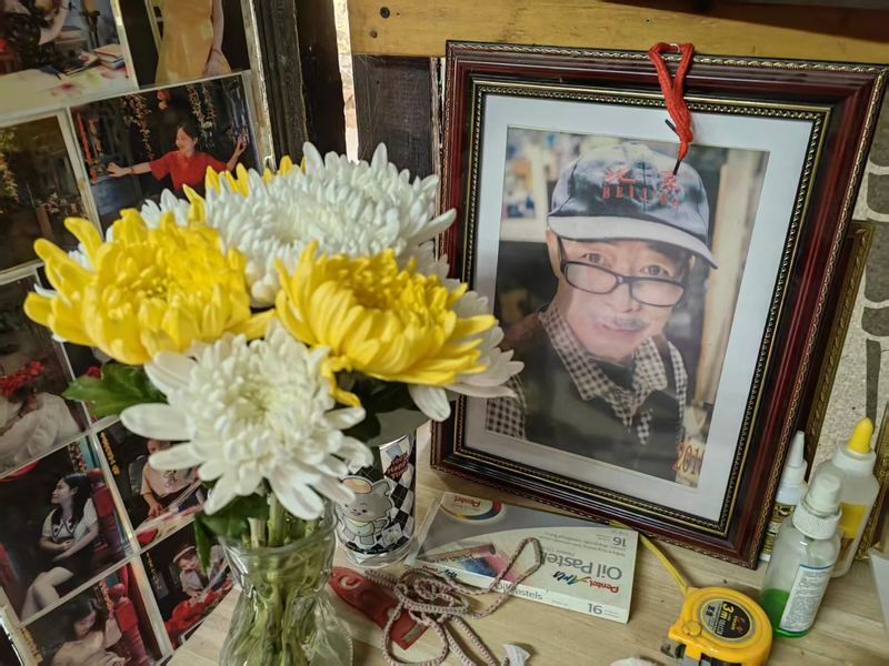 周泉虎为自己挑选的遗像,旁边摆着生前告别会上亲友敬献的鲜花。新京报记者 刘思维 摄