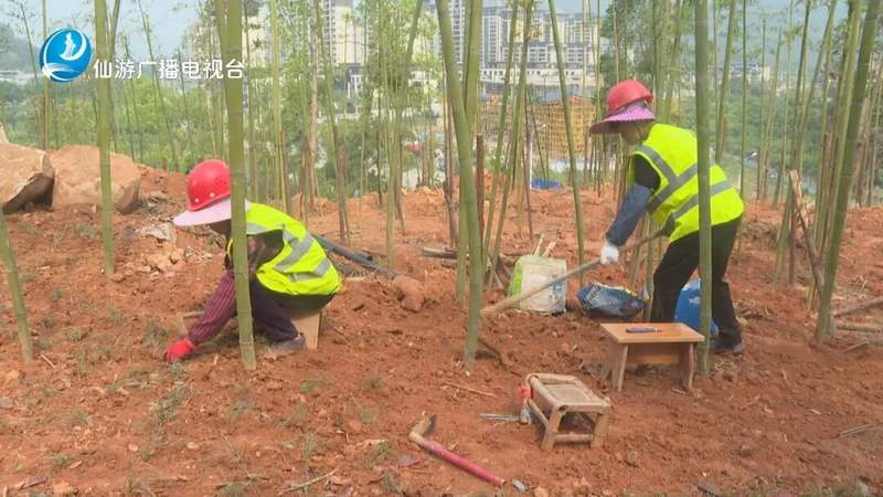 3月31日上午,项目施工现场,公园内2公里长的石板步游道、4座休息凉亭、160盏路灯均完成施工建设。数名工人正沿着步游道开展植绿植栽种作业,为公园增添绿意。