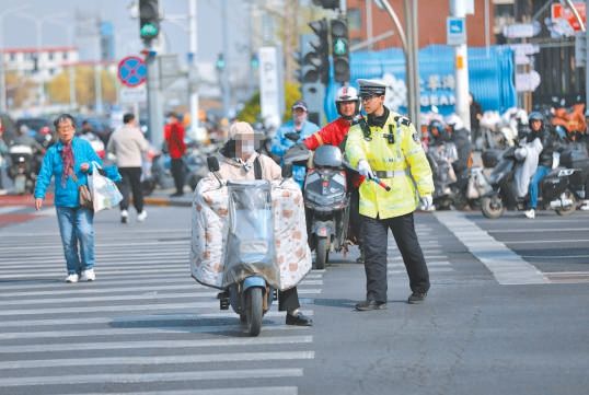 4月2日上午,交警在通州区新华西街与新华东街路口处,对非机动车开展违法纠正和宣传劝导活动。北京日报记者 甘南摄