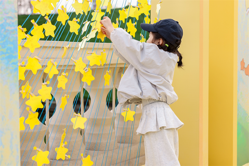 第三章“汇聚星光”,设置了互动留言展板,邀请游客写下祝福与鼓励。展览落地短短一天内,许多前来游玩的大小游客便自发来到留言板前,用绘画和文字为“星星的孩子”留下支持。善意的祝福汇聚成温暖的星河,照亮他们的成长之路。