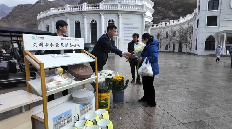 陵园之内,文明新风尽显。在九公山陵园入口,不少市民手捧鲜花前来祭扫。工作人员现场发放文明祭扫倡议书,提供免费鲜花和祭扫工具。大家不再焚烧纸钱、点燃香烛,而是静静摆放花束、轻声诉说思念,以简约庄重的方式缅怀先人,让追思更温情、更文明。