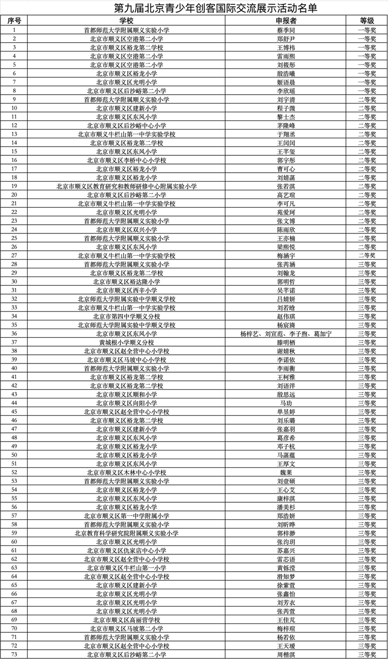 顺义区融媒体中心消息 日前,第45届北京青少年科技创新大赛和第九届北京青少年创客国际交流展示活动在北京化工大学昌平校区举办。顺义区参赛团队表现亮眼,共获得一等奖9项、二等奖27项、专项奖1项、三等奖63项,充分展现顺义青少年的科创实力与创新风采。