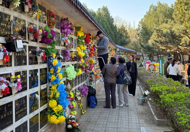 4月4日是清明假期首日,北京进入市民集中祭扫高峰。八宝山人民公墓入口处,市民进入陵园。