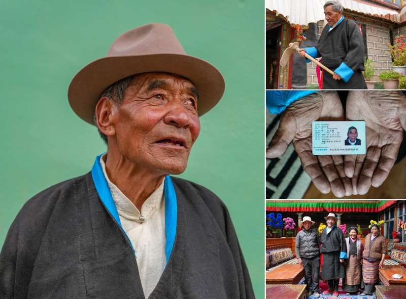 拼版照片:(左)达瓦片多的肖像(3月12日摄);(右上)达瓦片多展示当农奴时使用过的农具(3月12日摄);(右中)达瓦片多的身份证(3月12日摄);(右下) 达瓦片多(左二)和家人在家中合影(3月12日摄)。