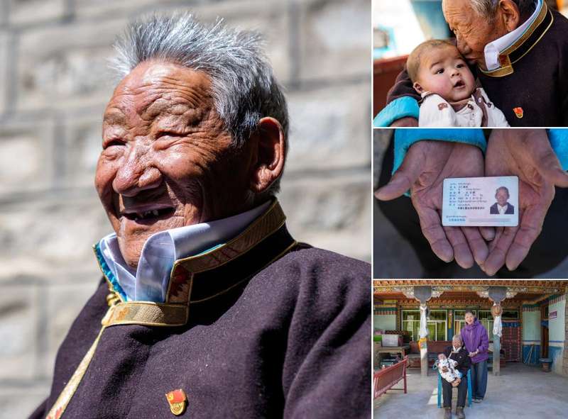 拼版照片:(左)嘎多的肖像(3月25日摄);(右上)嘎多(左)在山南市乃东区昌珠镇卡多村的家里和儿媳逗曾孙玩(3月25日摄);(右中)嘎多的身份证(3月25日摄);(右下)嘎多(中)在山南市乃东区昌珠镇卡多村的家里和家人合影(3月25日摄)。