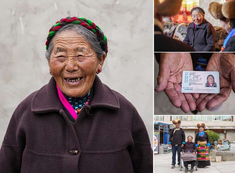 拼版照片:(左)次仁桑姆的肖像(3月26日摄);(右上)次仁桑姆(中)和两位晚辈在宗卡村家中的院子里聊天(3月26日摄);(右中)次仁桑姆的身份证(3月26日摄);(右下)次仁桑姆(后左2)和家人在宗卡村家中合影(3月26日摄)。