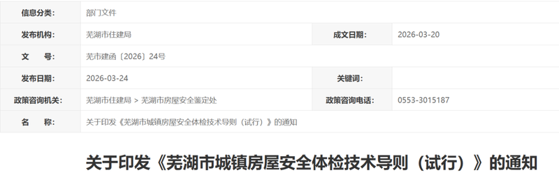 如何进行城镇房屋安全体检?存在使用安全隐患时应该怎么处理?由市住建局组织编制的《芜湖市城镇房屋安全体检技术导则(试行)》(以下简称《导则》)近日印发。该《导则》主要内容包括基本规定、地基基础、房屋安全体检报告与信息档案等9个部分,规范了芜湖市行政区域内房屋安全体检的程序、内容、方法等要求,明确房屋安全体检的技术标准。