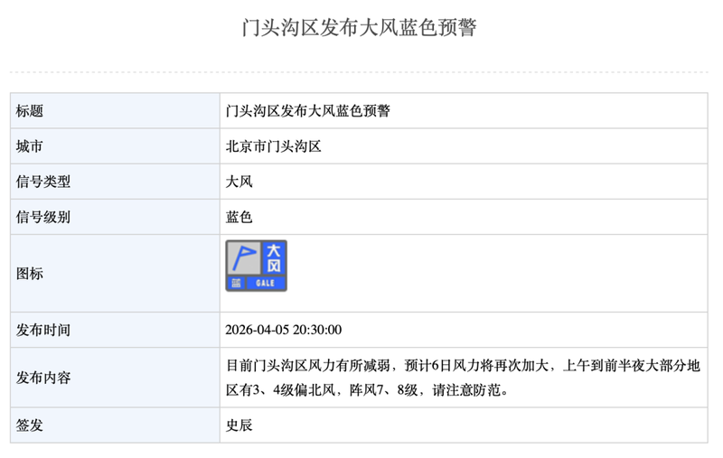 门头沟区气象台4月5日20时30分继续发布大风蓝色预警:目前门头沟区风力有所减弱,预计6日风力将再次加大,上午到前半夜大部分地区有3、4级偏北风,阵风7、8级,请注意防范。