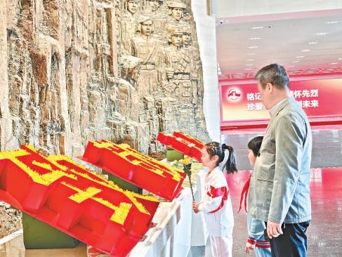 9时,观众方先生一家在序厅领取鲜花后,在献花台前,肃穆地鞠躬、敬献。“今天是清明节,是表达思念的日子。我们不能忘记先烈们,因为他们的无畏,我们才过上了今天的幸福生活。”方先生说,特意带孩子来参观,希望她了解历史,铭记历史。