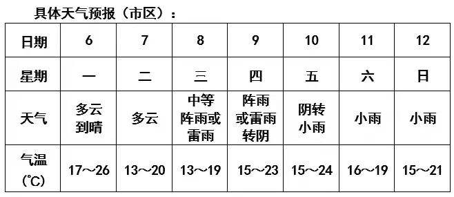 本周天气趋势:受冷暖空气交汇影响,8-12日,芜湖市以阴雨天气为主,其中,8-9日可能伴有短时强降水,局地雷暴大风等强对流天气。7-8日、11-12日最高气温下降至19~21℃,其余时间最高气温23~26℃。