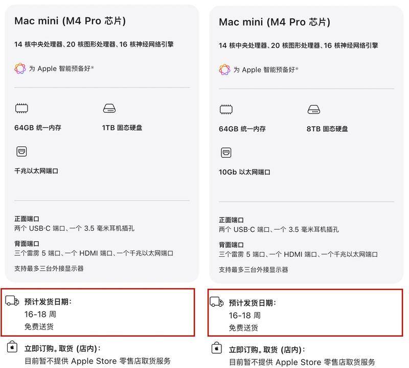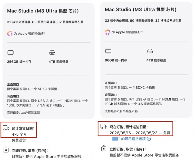 若选择大内存容量的Mac mini和Mac Studio机型,预计配送等待时长最长可达4-5个月。