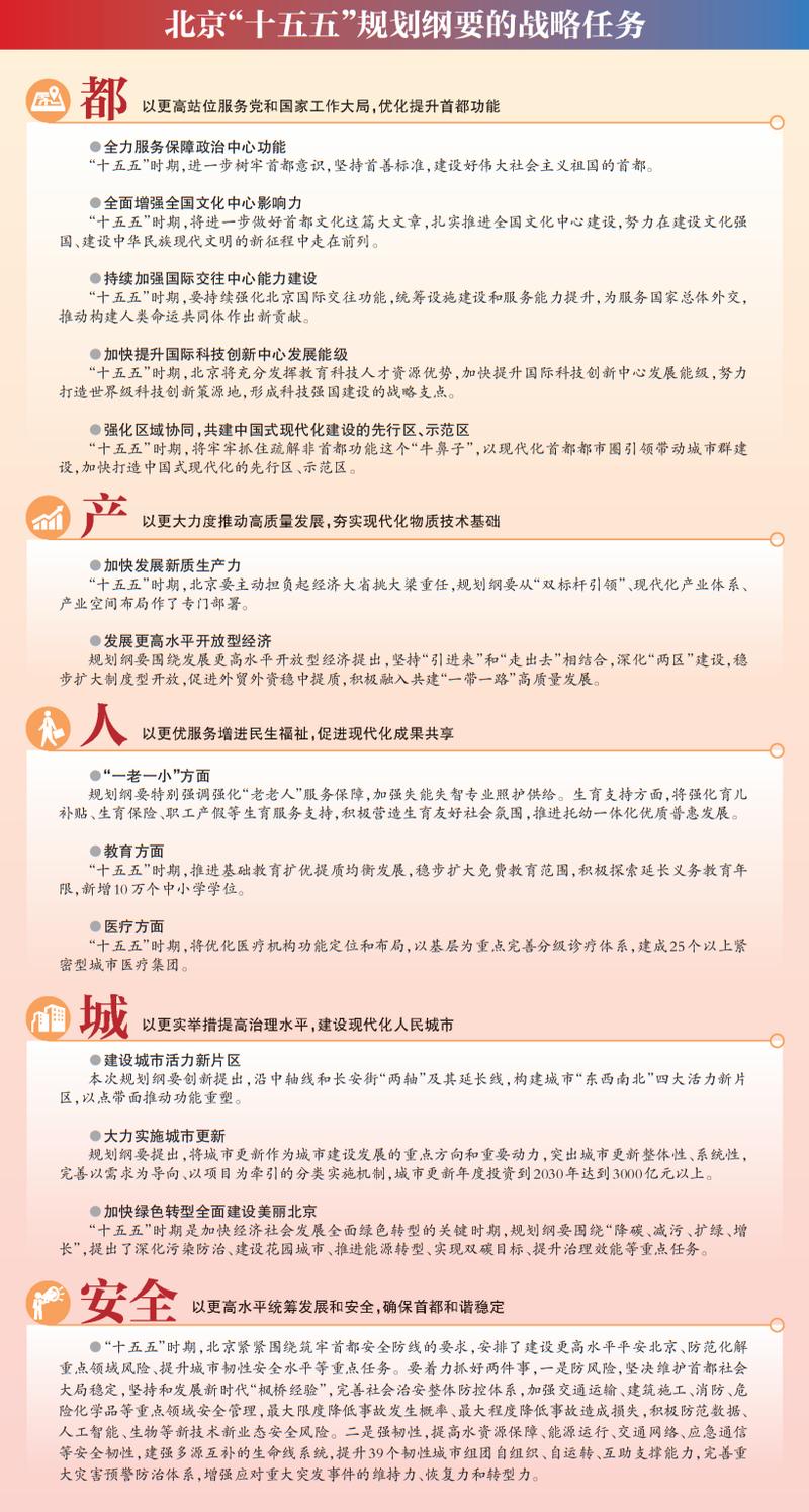 15篇59章,这部全面擘画了北京未来五年的发展路径与建设目标,涵盖“都”“产”“人”“城”“安全”五个方面的规划纲要,具体包含哪些内容?设定了怎样的目标?又设计了怎样的实现途径?
