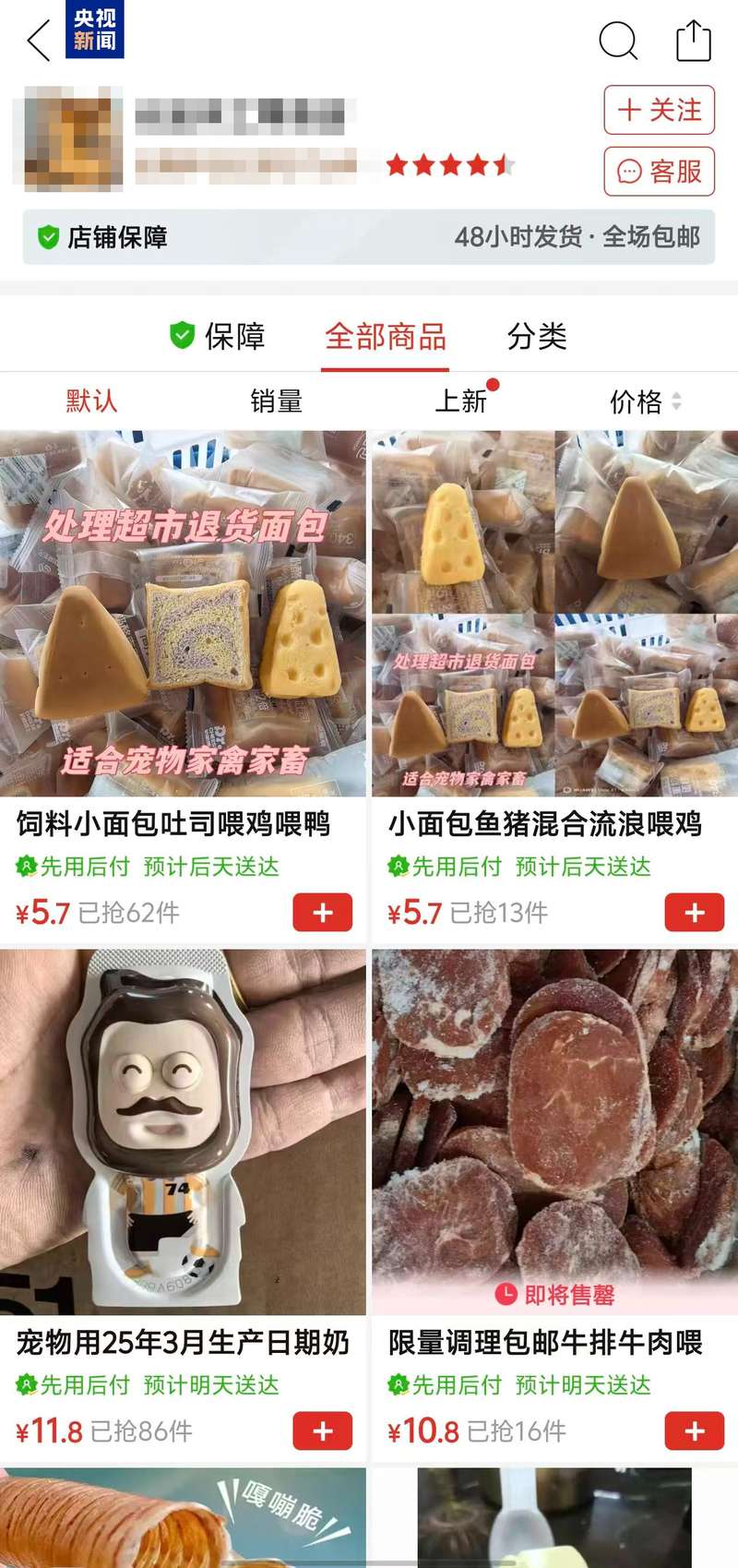 在某电商平台一家店铺内,这里售卖各类动物饲料、“平替”面包、糕点以及超市下架的各品牌进口饼干等等。记者设法联系上了该店铺的负责人,一位名叫“东风”的商家在电话中介绍,他们批发售卖各类过期食品,包括面包、香肠、烧鸡、零食等等,把这些过期食品当作宠物食品卖,仅仅是其中的很小一部分。