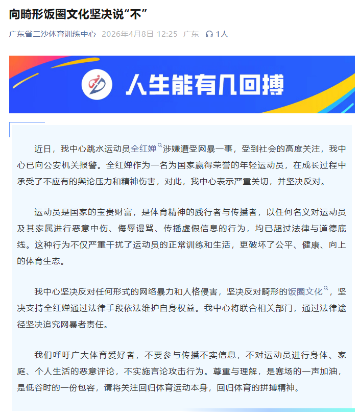 我们呼吁广大体育爱好者,不要参与传播不实信息,不对运动员进行身体、家庭、个人生活的恶意评论,不实施言论攻击行为。尊重与理解,是赛场的一声加油,是低谷时的一份包容,请将关注回归体育运动本身,回归体育的拼搏精神。