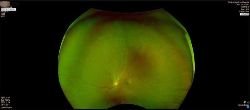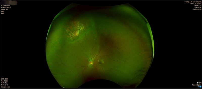郝宏翔医生接诊后,经详细检查,发现小李的病情相当复杂:左眼视网膜已经大范围脱离,涉及眼底多个区域,且存在两个裂孔。幸运的是,视网膜脱离尚未波及视力最敏锐的黄斑区——这意味着如果及时治疗,视力还有挽救的希望。