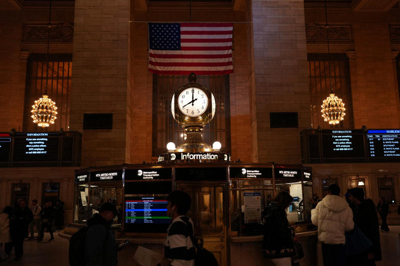 当地时间2026年4月7日,美国纽约,纽约中央车站里的时钟显示美国东部时间晚上8点,这是特朗普为伊朗开放霍尔木兹海峡设定的最后期限。图/IC photo