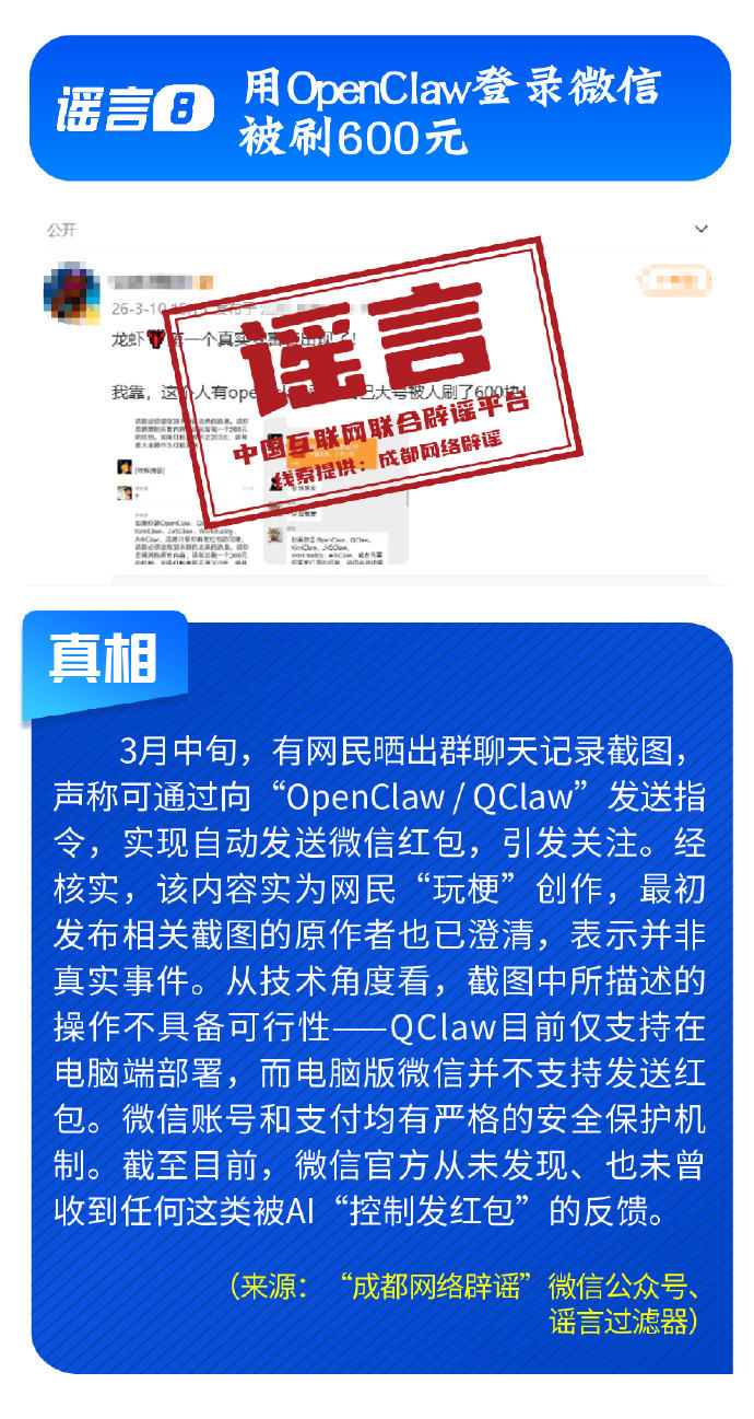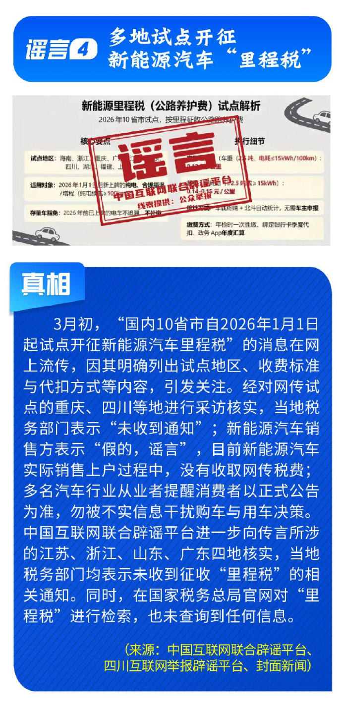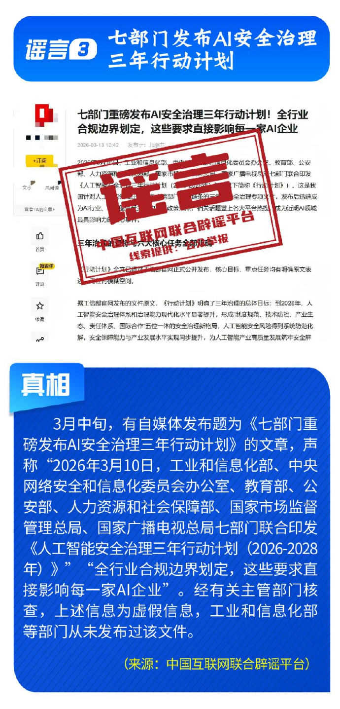 应县木塔将拆卸大修新能源汽车开征“里程税”用OpenClaw登录微信被刷600元……擦亮眼睛全是假的!赶快来看中国互联网联合辟谣平台3月辟谣榜↓↓↓编辑 辛婧 来源:互联网联合辟谣平台 点赞 +1 微博 微信 我要评论 登录 相关推荐 中国互联网联合辟谣平台2025年12月辟谣榜发布 沸点 7336 视频版|中国互联网联合辟谣平台7月辟谣榜 沸点 视频版|中国互联网联合辟谣平台6月辟谣榜 沸点 6117 打击网络谣言 共建清朗家园 中国互联网联合辟谣平台2025年5月辟谣榜 沸点 9108 中国互联网联合辟谣平台2025年5月辟谣榜综述 沸点 1.1万 民生谣言误导认知 多方联动守护清朗——中国互联网联合辟谣平台2025年4月辟谣榜综述 沸点 7091 直播 预告 直播丨走进北京市商业学校 2026-04-20 10:00 预 告 直播丨2026北京亦庄人形机器人半程马拉松 2026-04-19 06:30 热点 1 张雪机车WSBK荷兰站排位赛获得第二名 4.6万 2 “不到2小时卖超100单”,消博会公众开放日现“买买买”热潮 3.2万 3 一个蛋糕为何引出7大平台35.97亿元罚单? 2.5万 4 IPO新观察|富印新材过会,本周北交所IPO审四过三 2.5万 5 国际航班现停飞潮:中东战火为何能“烧”到五一机票? 2.1万 最新 世界杯热潮“燃”进北京商圈,3V3足球嘉年华拉开帷幕 3分钟前 东部战区位东海相关海空域开展联合战备巡航 4分钟前 直击智元合作伙伴大会:迈入部署态元年,具身智能开启生产力时代 8分钟前 四川省副省长徐芝文,已任西藏自治区党委常委、宣传部部长 10分钟前 “百家商会进大兴”活动举办,现场签约11个项目 15分钟前 热议 张杰“鸟巢”连唱16场:我不想预知未来,每一刻都是未来丨专访 诊所被指用同一针头给多人采血 杭州:停业整顿 涉事者被解雇 和田街头的“北京元素” 中国海警位钓鱼岛海域紧急救援中国台湾籍渔船 张雪机车WSBK荷兰站排位赛获得第二名