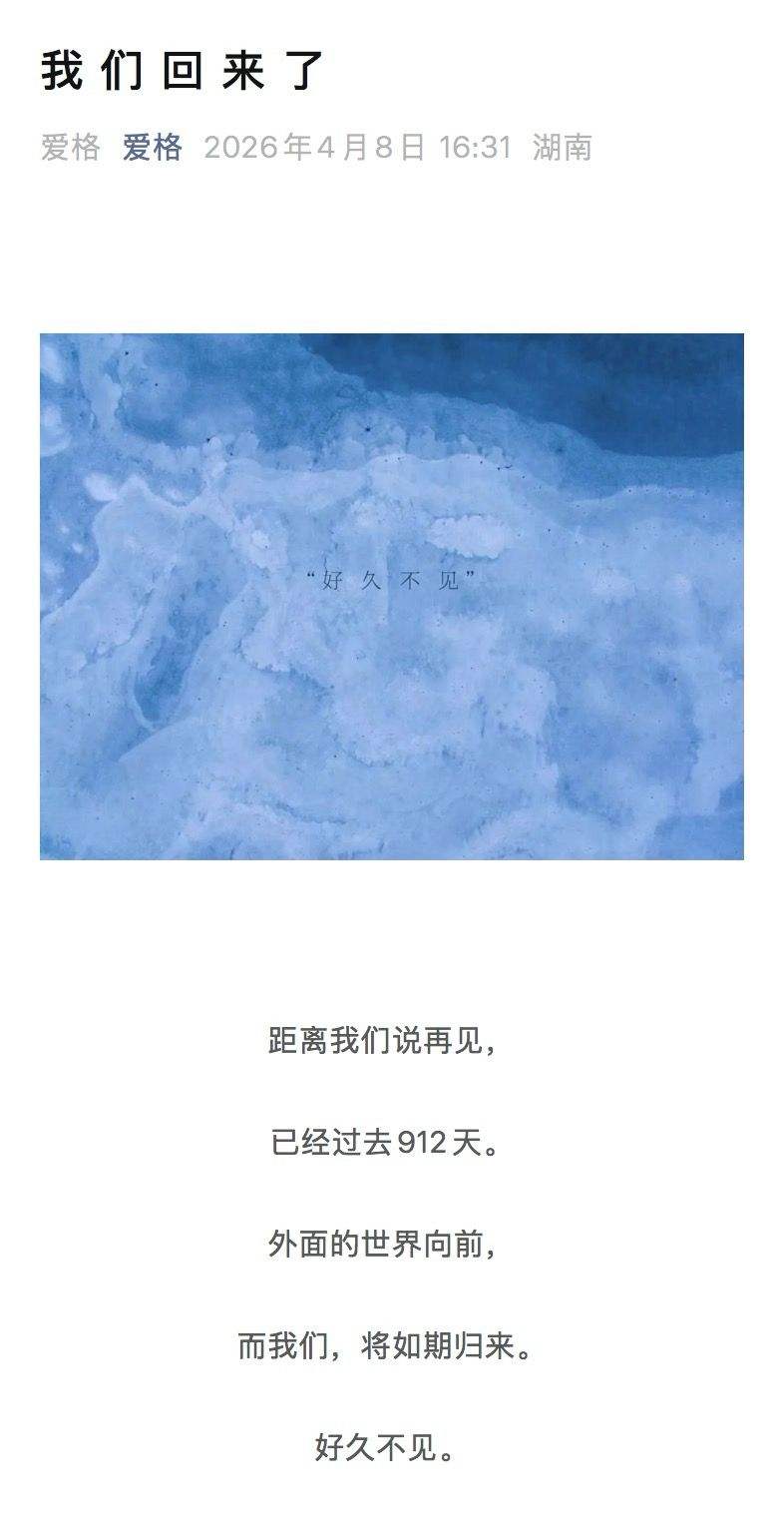 新京报讯 2026年4月8日,《爱格》杂志宣布回归。据悉,2023年10月9日,《爱格》杂志宣布于同年11月起停刊。截至2026年4月8日,《爱格》杂志已停刊912天。编辑 刘佳妮 10 +1 微博 微信 我要评论 登录 热点 1 经营质量稳定向好,长安汽车交出“质效双升”成绩单 38.0万 2 贵州织金一山体垮塌岩石崩落 附近村民:80米外灰尘扑面而来 8.6万 3 国际丨中国人形机器人在波兰街头“赶野猪”,驱赶后挥手拜拜 7.2万 4 伊朗要求巴林、沙特阿拉伯等五个中东国家赔偿战争损失 3.9万 5 跳出《第二性》,为波伏瓦制作一尊属于她的雕像 3.6万 最新 齐《论语》和秦汉全本《诗经》竹简首次公开展出 2分钟前 中科宇航力箭一号完成“一箭8星”发射 6分钟前 2026“天枢杯”青少年人工智能安全创新大赛在京正式启动 6分钟前 新发地市场加速转型升级:水果交易A厅已投用,蔬菜楼6月底完工 7分钟前 新技术变废为宝,中国农科院展示种植废弃物循环利用智能装备 8分钟前 热议 中央社会工作部负责人就《关于推动行业协会商会深化改革的意见》答记者问 视频|丢东西别慌!机场失物招领处全流程揭秘 北京“创新医药32条”:突出原始创新,打通手术机器人入院堵点 13岁河南男孩被村道横绳割断气管续:已转北京救治,警方已介入 蔡皋成为中国首位国际安徒生奖插画家奖得主