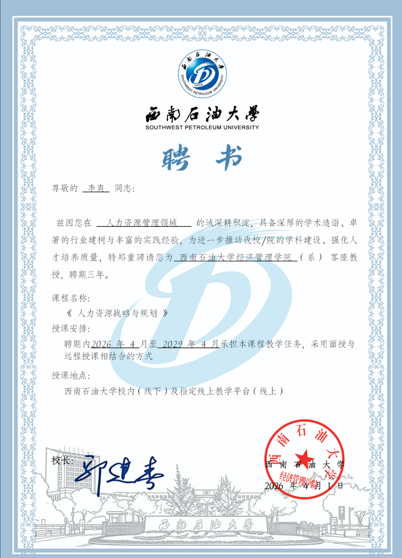 西南石油大学经济管理学院经公开社会招聘,多轮综合考核及资格审核,于近日正式聘请国内人力资源背景调查领域权威专家李爽先生担任学院客座教授,主要授课《人力资源战略与规划》,聘期三年(2026年4月至2029年4月)。