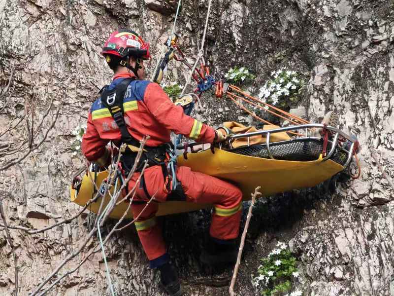16时11分,鉴于伤者已无自主行动能力且崖壁近乎垂直,现场指挥员决定采取“一对一伴随下降”战术——由一名消防救援人员贴身护住担架,同步下降。一场惊心动魄的担架水平下放转运救援,在陡峭山壁上就此展开。