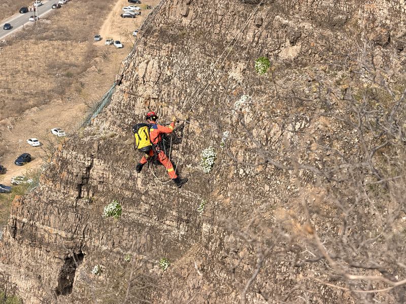 消防员紧贴崖壁进行攀爬。门头沟消防供图