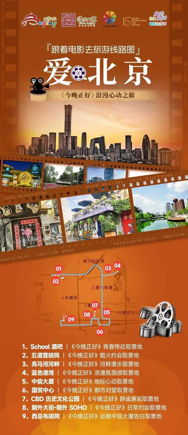 北京电影生活节期间将推出10条“跟着电影去旅游”主题线路,以经典影片为线索,串联京城核心地标,让观众们在光影的世界里尽情翱游。