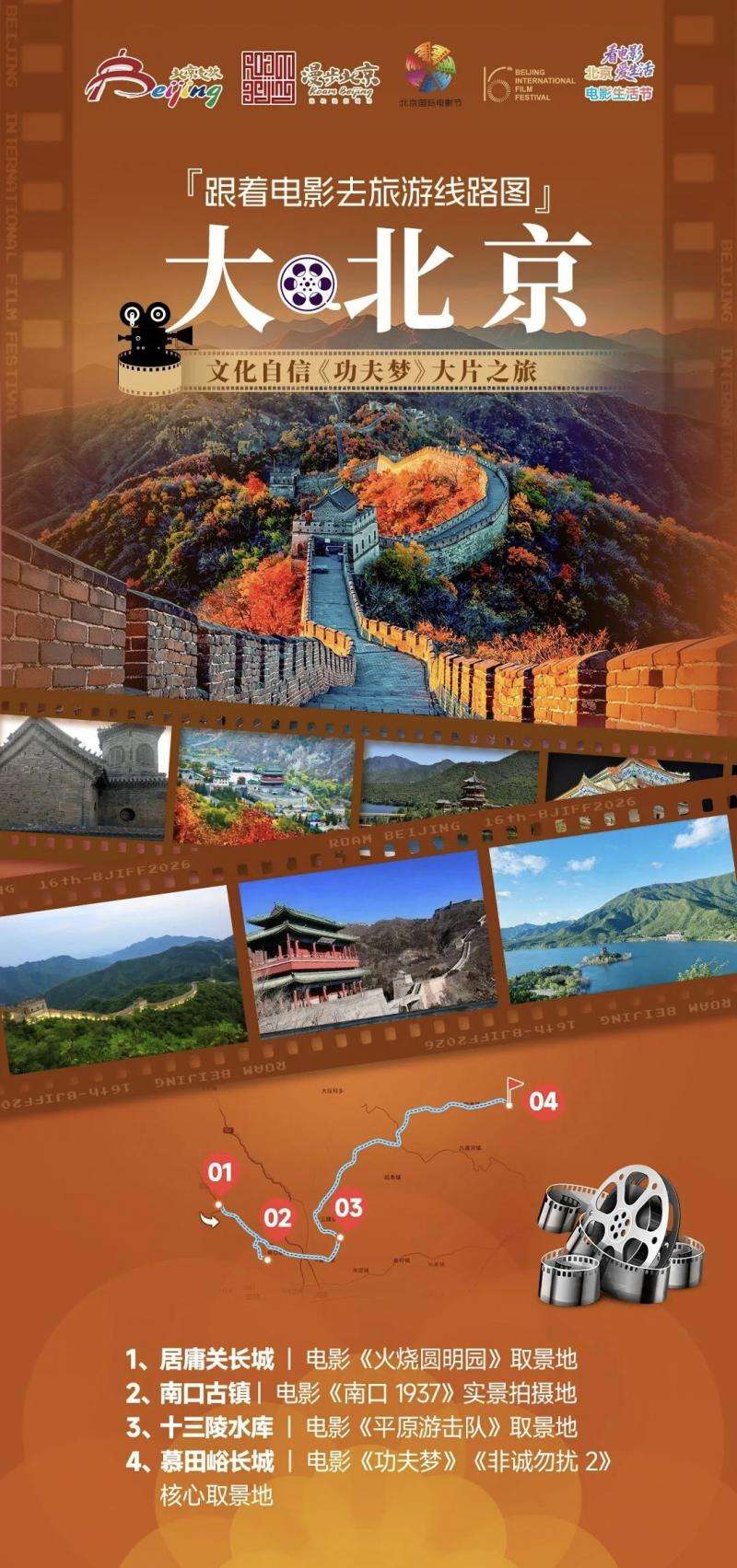 线路解说:从居庸关长城出发,追寻《火烧圆明园》的历史印记,感受雄关承载的百年沧桑;走进南口古镇,回望《南口1937》的烽火岁月,致敬抗战先辈的热血坚守;途经十三陵水库,邂逅《平原游击队》的经典红色记忆;最终抵达慕田峪长城,在《功夫梦》的励志特训地感受成长力量,在《非诚勿扰2》的浪漫取景地邂逅温情诗意,一站式解锁大北京的影视传奇与山河盛景。