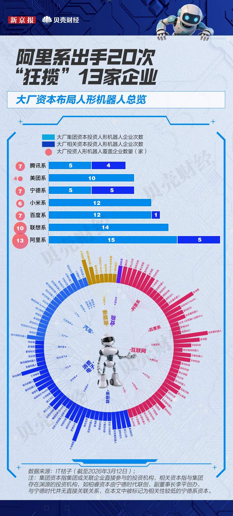 新京报贝壳财经记者梳理看到,阿里系几乎全线出击,涵盖阿里巴巴、阿里云、蚂蚁集团等自有资本及云锋基金等相关资本,合计投资20次,覆盖13家企业,是人形机器人赛道上最活跃的大厂玩家。紧随其后的是联想系(14次,10家企业)、百度系(13次,7家企业)和小米系(12次,6家企业)。