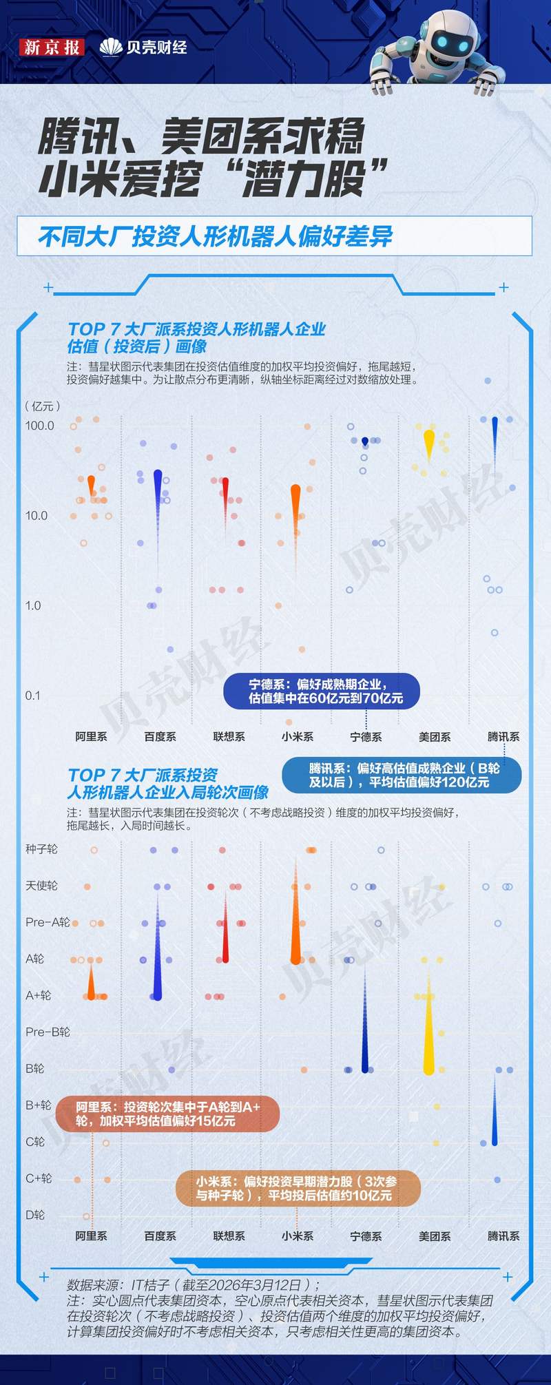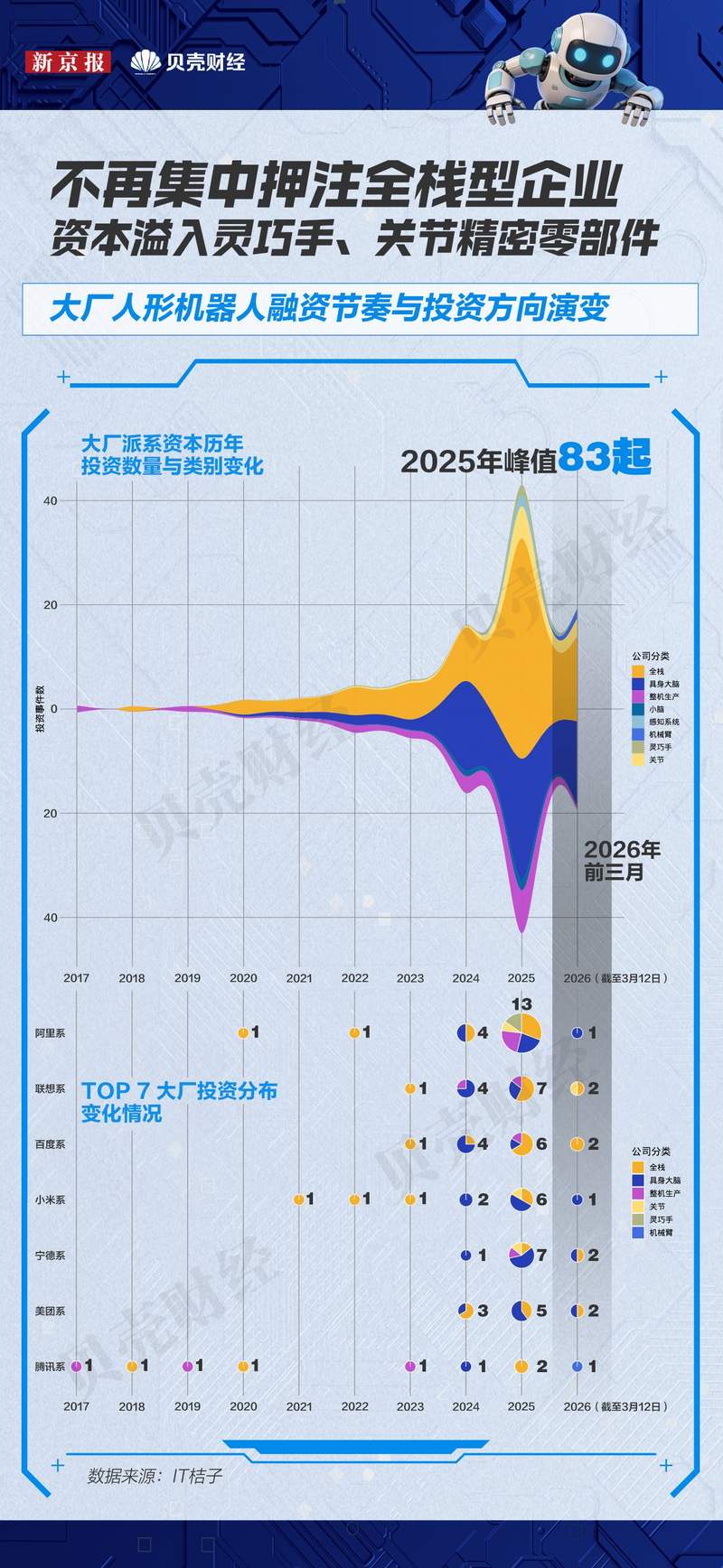 新京报贝壳财经记者梳理2014年以来151笔大厂系资本投资事件发现,2025年,大厂系资本争相涌入全栈明星企业,一度引发融资泡沫讨论。但随着人形机器人量产和商业落地预期日益清晰,如今大厂系资本投资布局逐渐延伸至关键零部件和细分技术领域,形成了多层次、全链条布局。