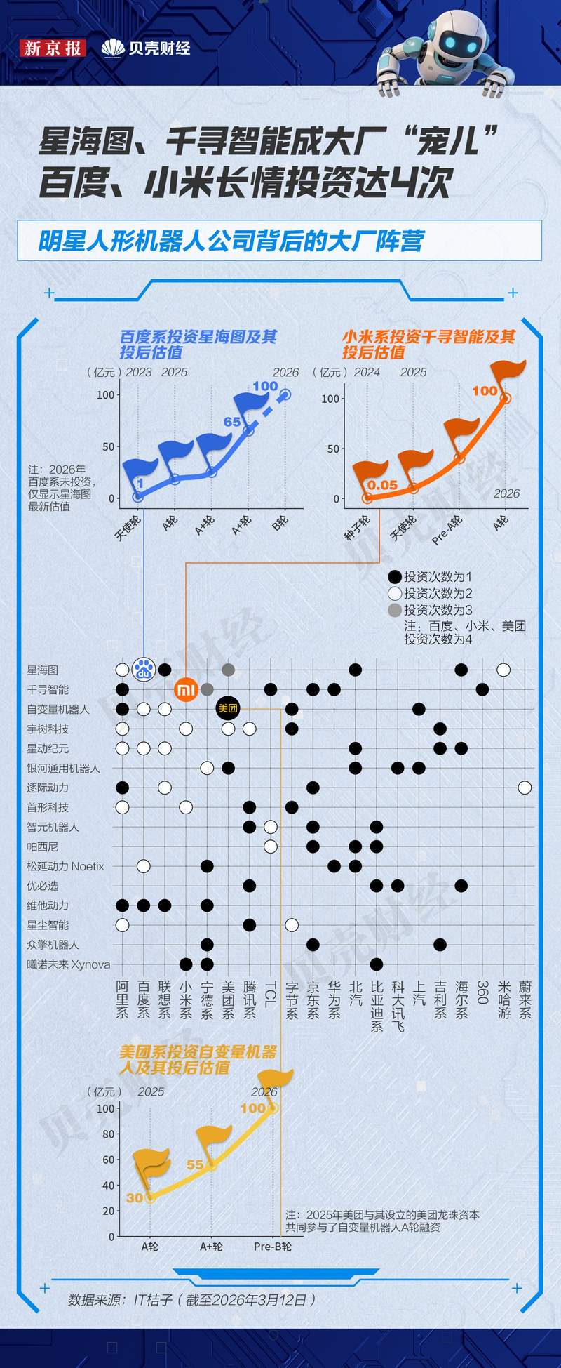 值得一提的是,星海图、千寻智能和自变量机器人分别获得了百度系、小米系和美团系的4次高频投资。