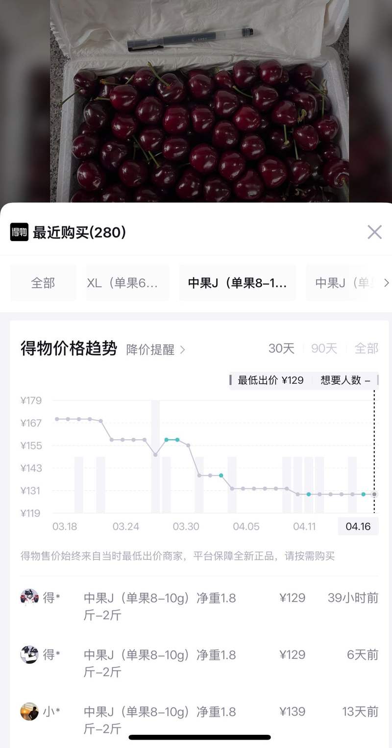 3月至今国产樱桃价格变化图。得物App截图
