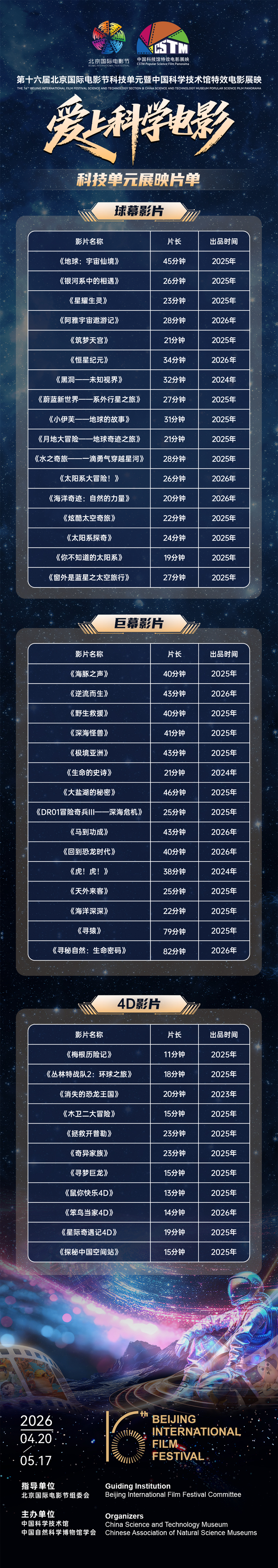 新京报讯(记者张璐)中国科学技术馆将于2026年4月20日至5月17日举办第十六届北京国际电影节科技单元暨中国科学技术馆特效电影展映活动。活动期间,部分影片0元公益放映。4月16日起,公众可通过中国科学技术馆官网或微信公众号预约部分影片0元票,包括《星耀生灵》 《马到功成》 《小伊芙——地球的故事》 《寻猿》 《窗外是蓝星》 《天外来客》 《月地大冒险——地球奇迹之旅》等7部优秀国内外科学电影。