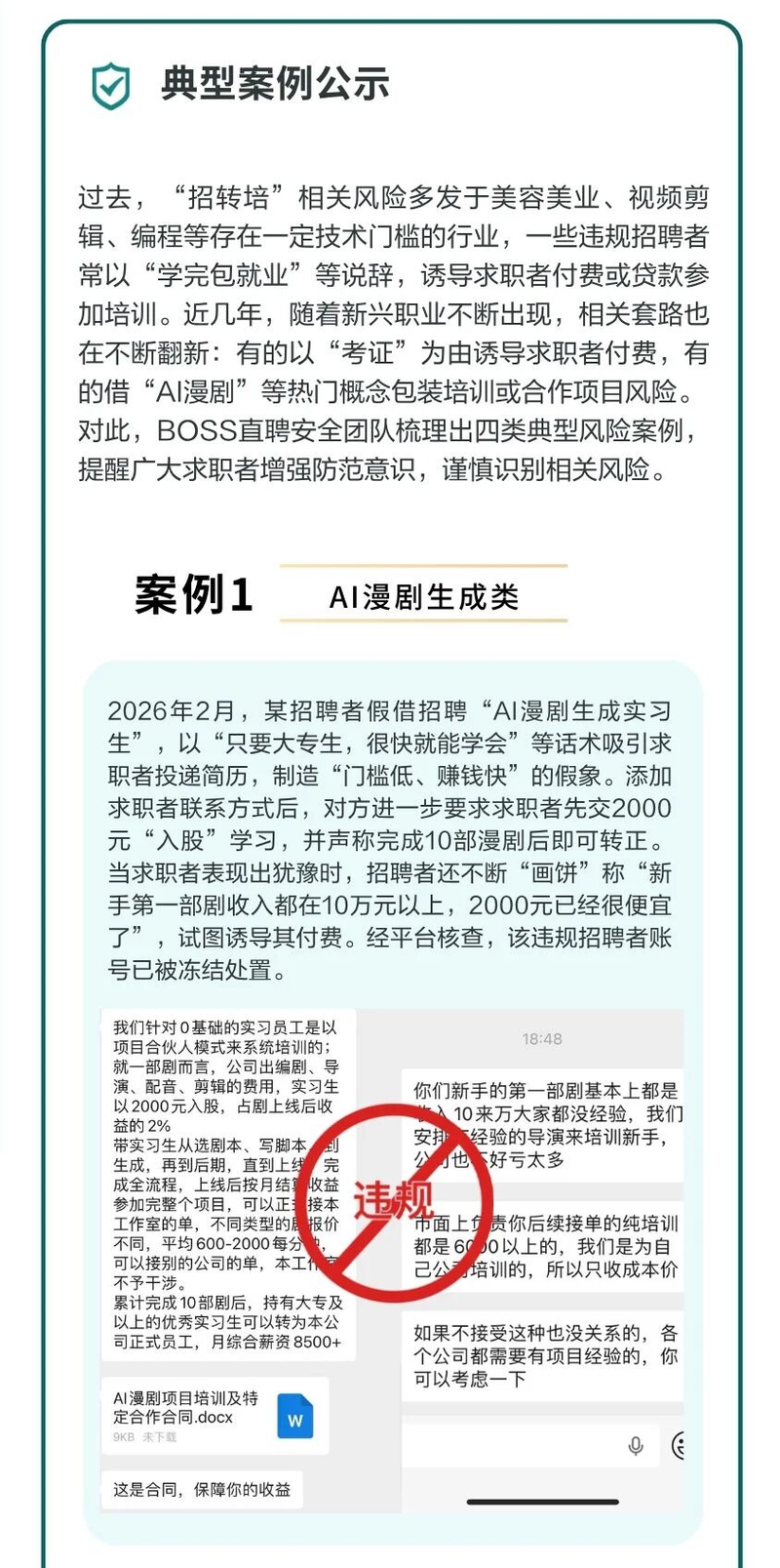 近日,招聘求职平台披露了一起“招转培”典型案例:某招聘者假借招聘“AI漫剧生成实习生”,以“只要大专生,很快就能学会”等话术吸引求职者投递简历,制造“门槛低、赚钱快”的假象。