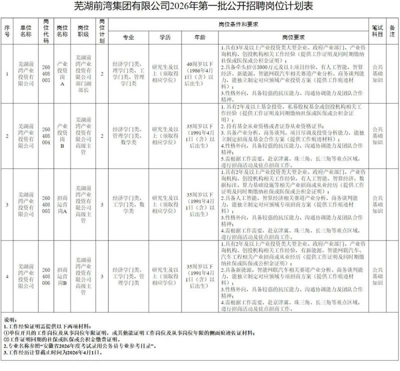 面向社会招聘招商人员10名,详见附件1《芜湖前湾集团有限公司2026年第一批公开招聘岗位计划表》。