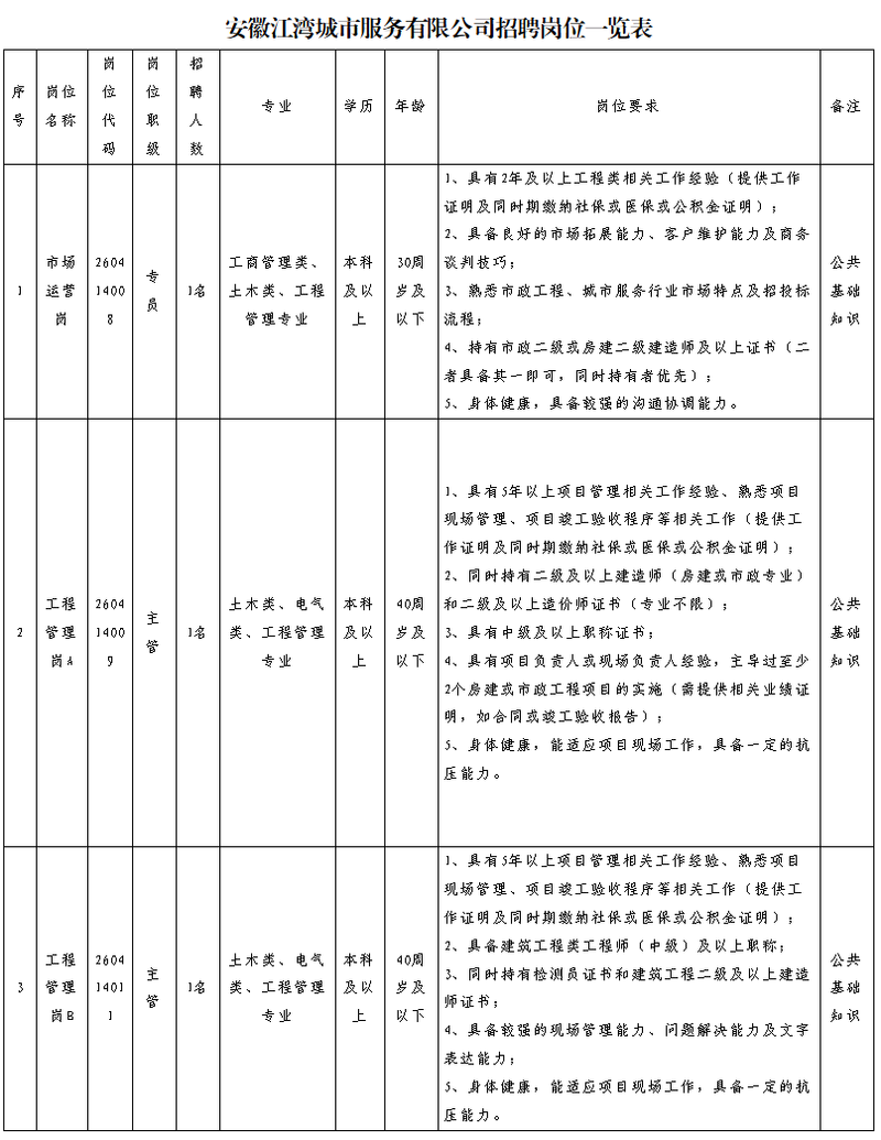 面向社会公开招聘下属公司正式员工3名,具体岗位为市场运营岗、工程管理岗A、工程管理岗B,详见附件:《安徽江湾城市服务有限公司2026年公开招聘岗位计划表》。