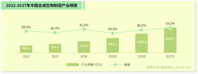 当前,全球合成生物产业保持较快发展势头,预计在2028年将成长为体量达到近500亿美元的全球型市场,其中合成生物制药的规模约175亿美元,占合成生物产业的比重为35%。具体到国内,根据赛迪顾问的数据,中国合成生物制造产业正处于高速增长期,2024年规模已接近800亿元,近三年增速均维持在25%以上。