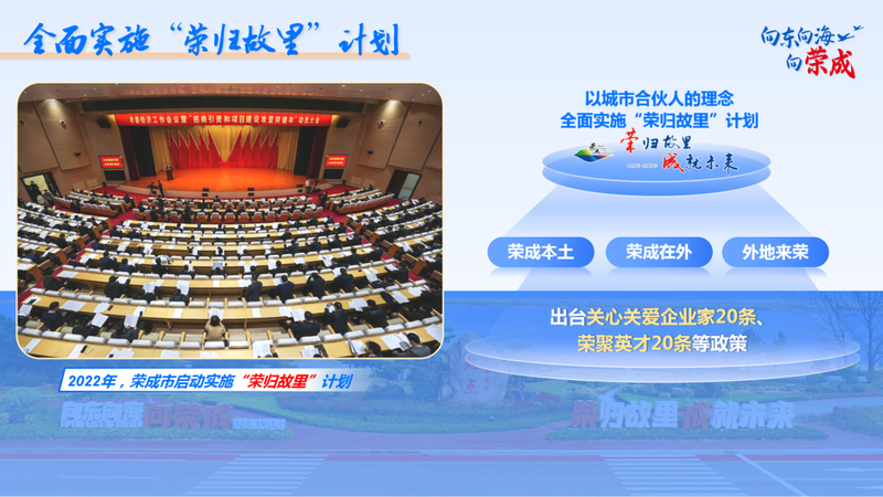 基于此,2022年2月8日,荣成市委经济工作会议暨招商引资和项目建设攻坚突破年动员大会提出,聚焦聚力产业强市、工业带动、突破发展海洋经济,深入实施“荣归故里”计划,从在外能人回归、推荐项目信息开始,打好“乡情牌”,引得“雁归来”,营造高质量发展优质环境和浓厚氛围。由此,吹响了实施“荣归故里”计划的号角,目的就是把荣成打造成投资的洼地、人才的高地、发展的福地,让“荣归故里·成就未来”成为荣成鲜明的城市品牌和强劲的发展动力。
